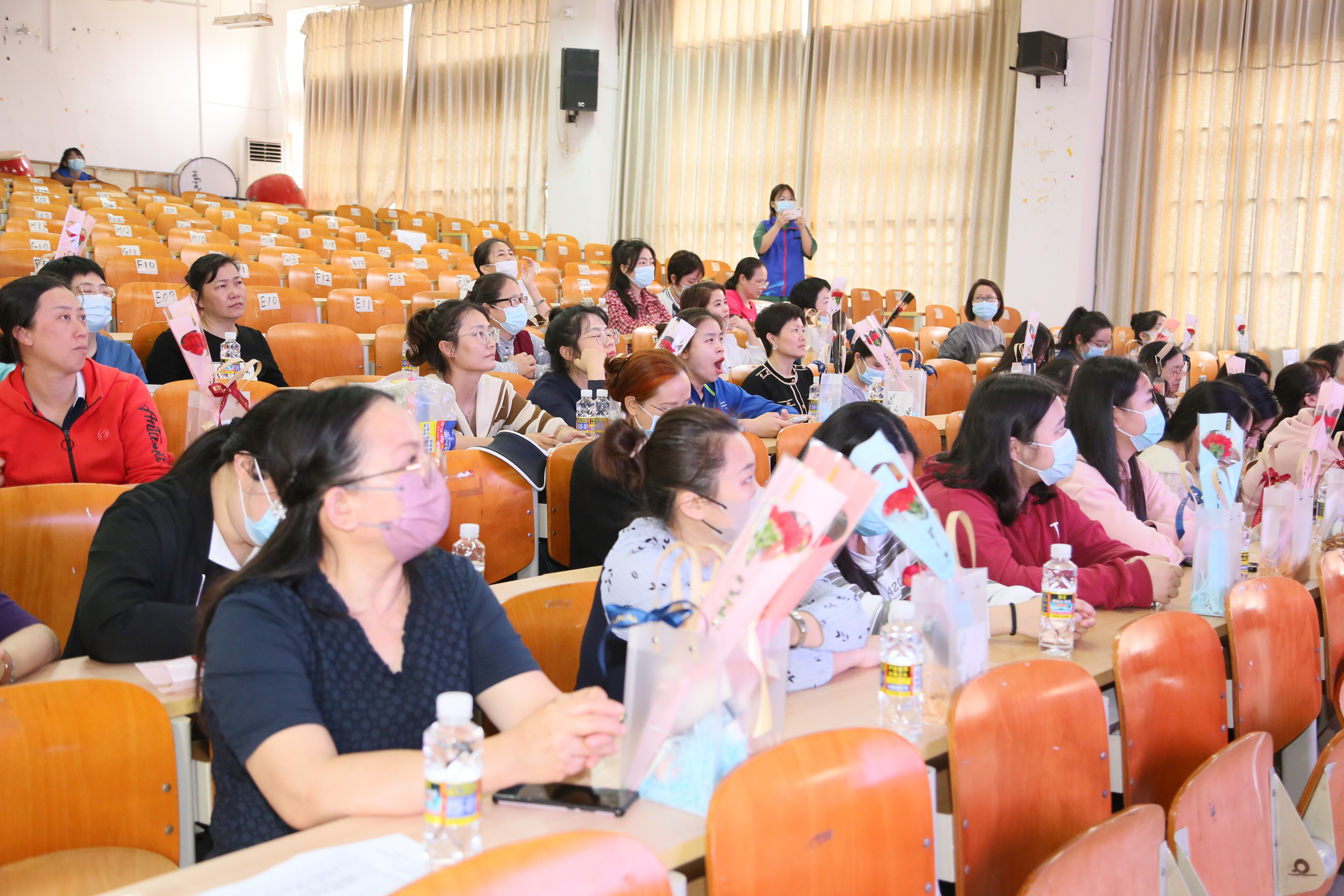 本次活动现场布置温馨,每位前来参加活动的女教职工都收到了一份小礼物,礼品袋内放置康乃馨、眉笔、眼线笔、修眉刀和美妆蛋五样小礼品。资深化妆造型师邓玉玲应邀到校为女教职工授课,她向大家详细介绍了美妆工具和化妆步骤,邀请老师做模特,进行现场化妆教学。大家认真学习着每一步化妆流程,在欢声笑语中,体验着美妆带来的乐趣。